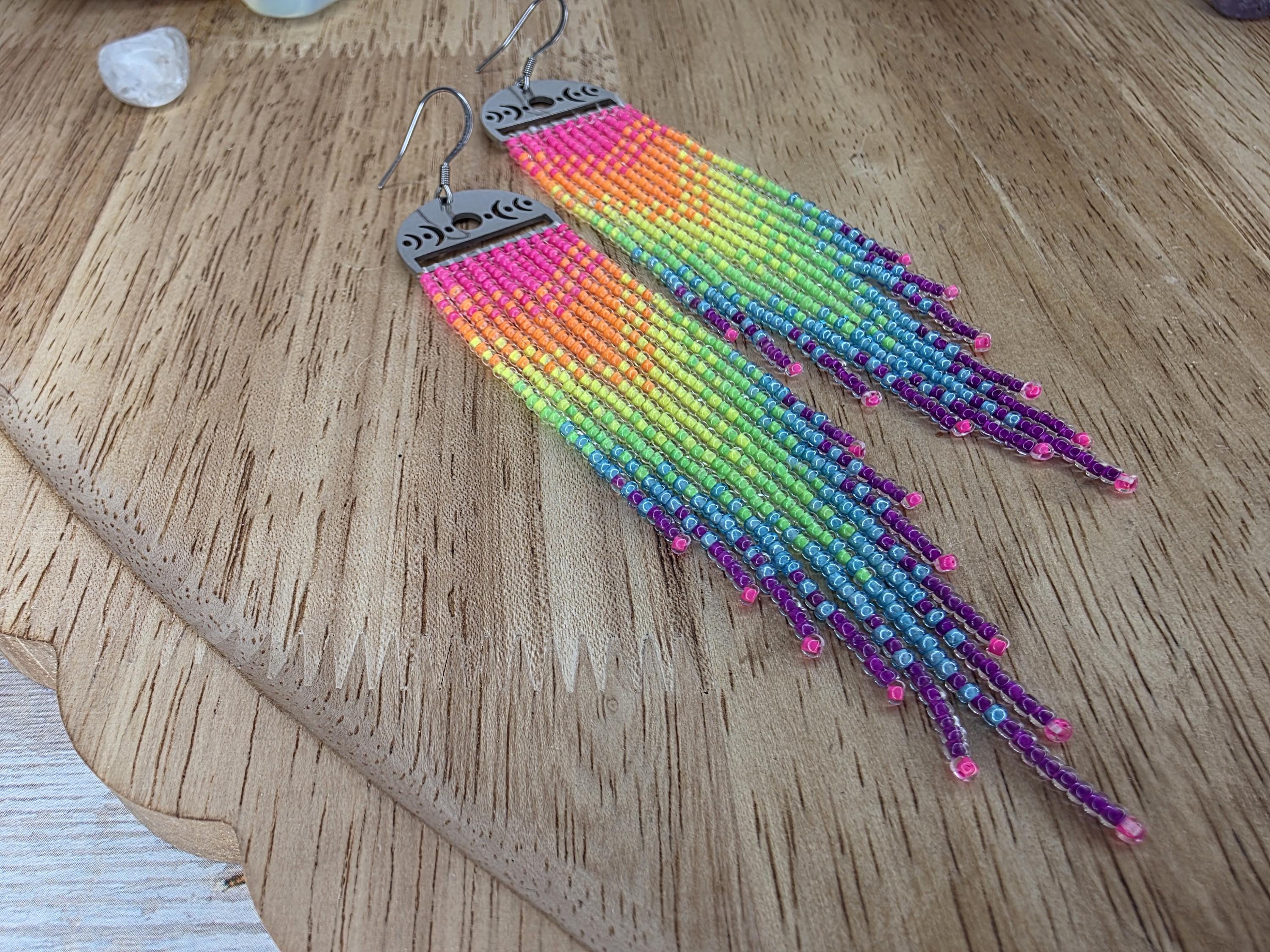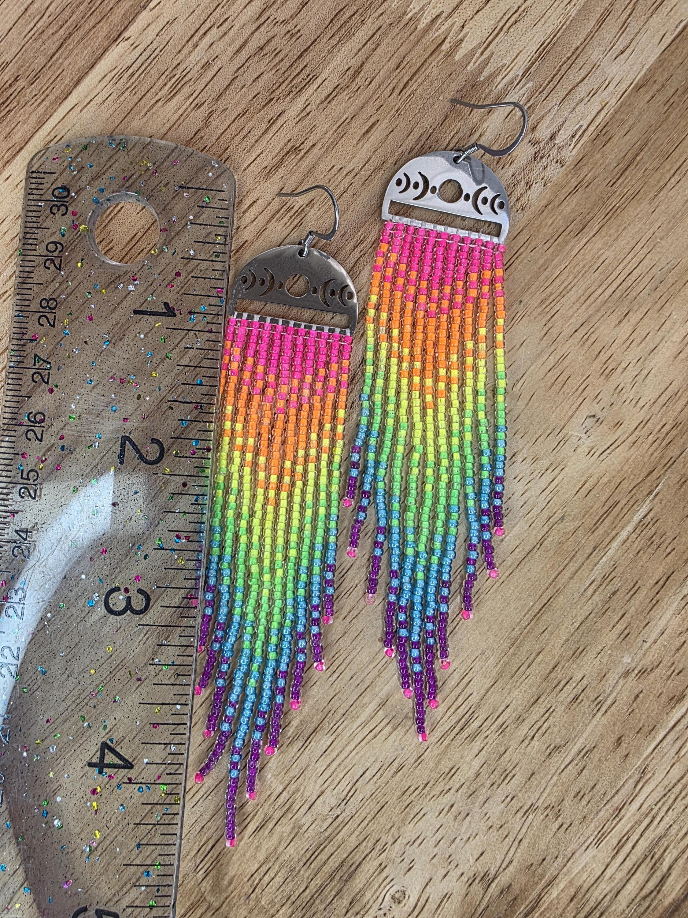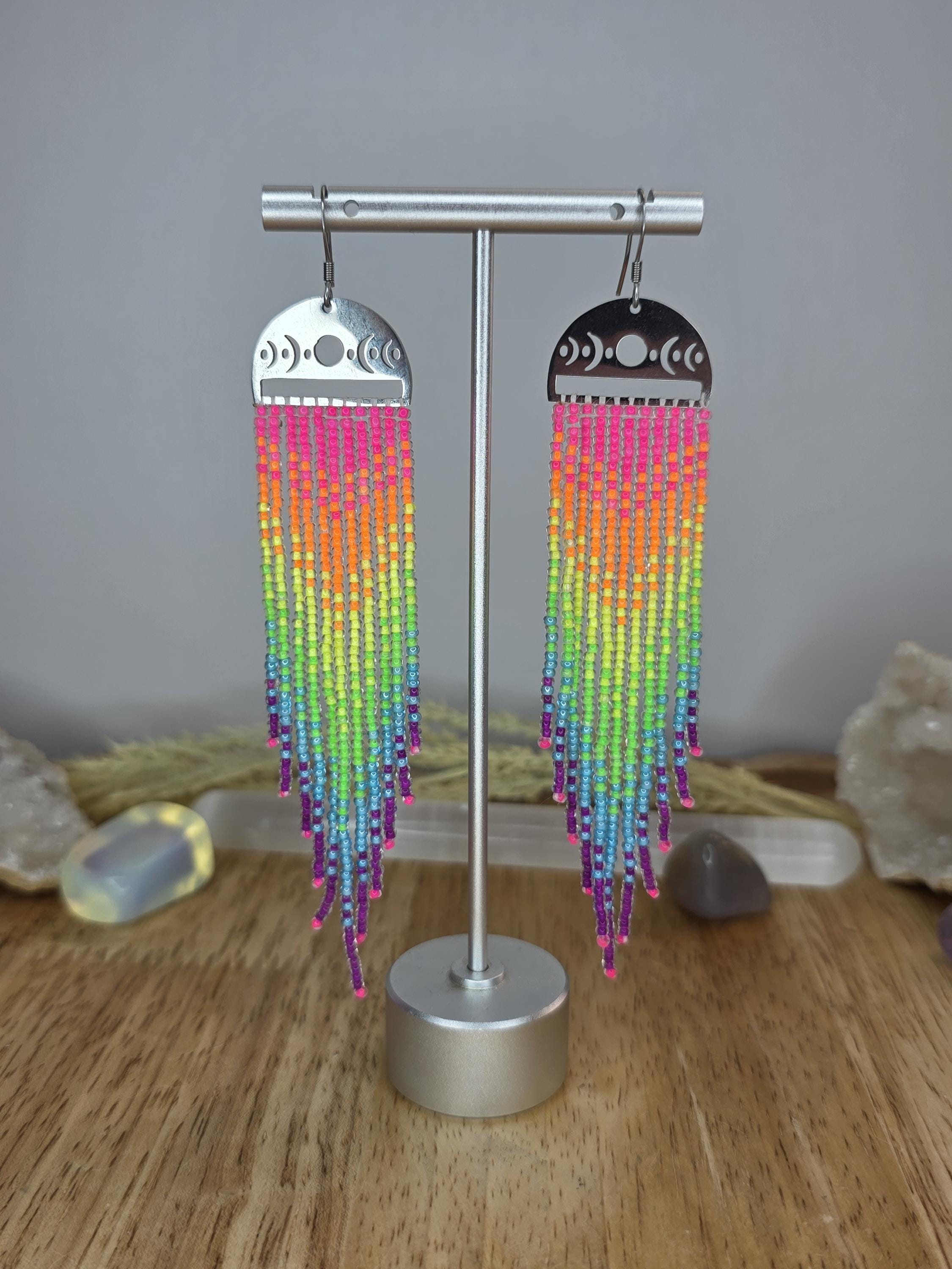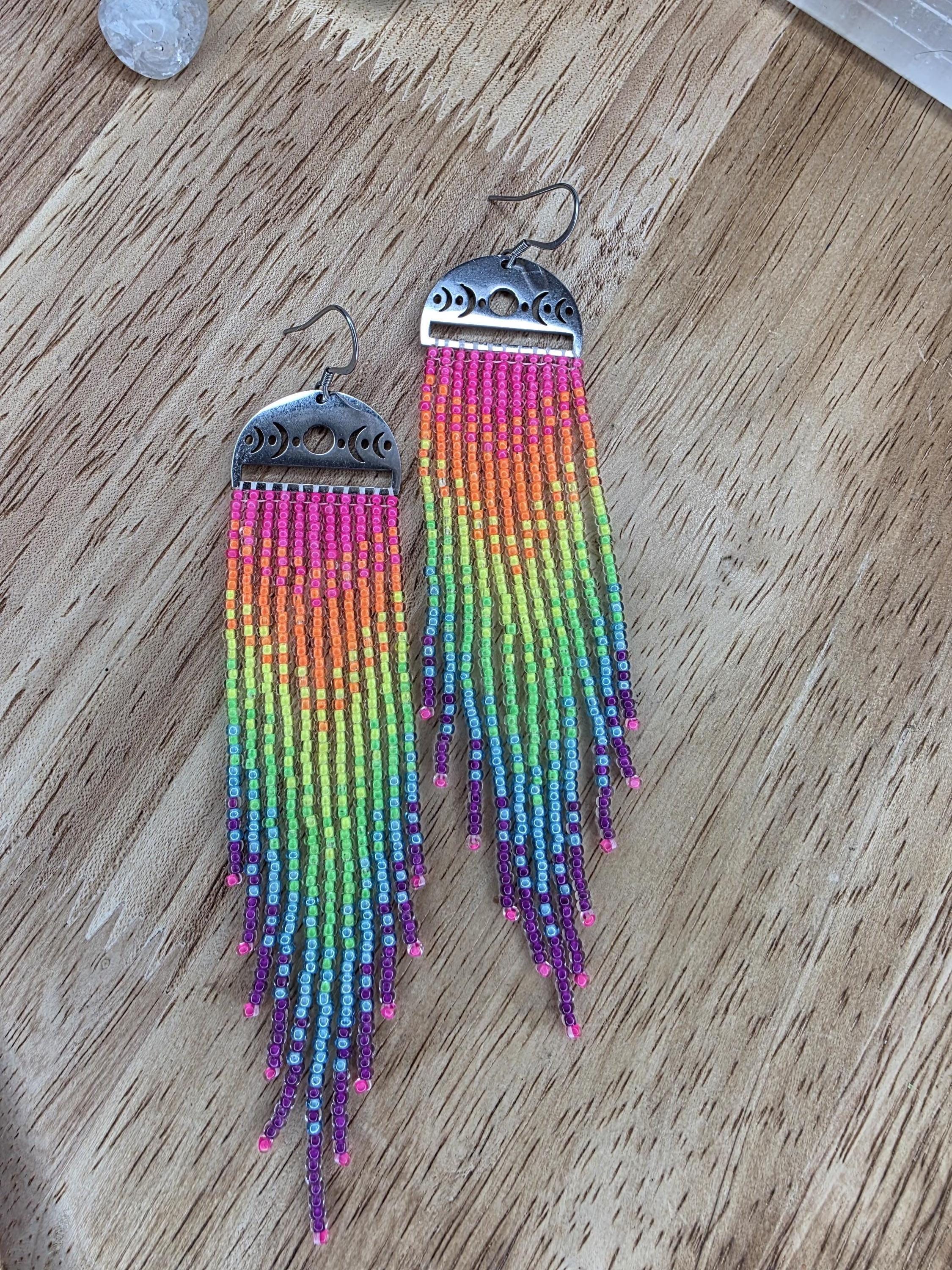 These earrings are hand beaded using neon lined Czech glass beads, in a vibrant neon rainbow pattern. The frames are stainless steel with moon phases. They bring a witchy flair anywhere you go. Very long, at about 4.75" from the top of the earwire. These earrings are extremely unique and one of kind stunners.