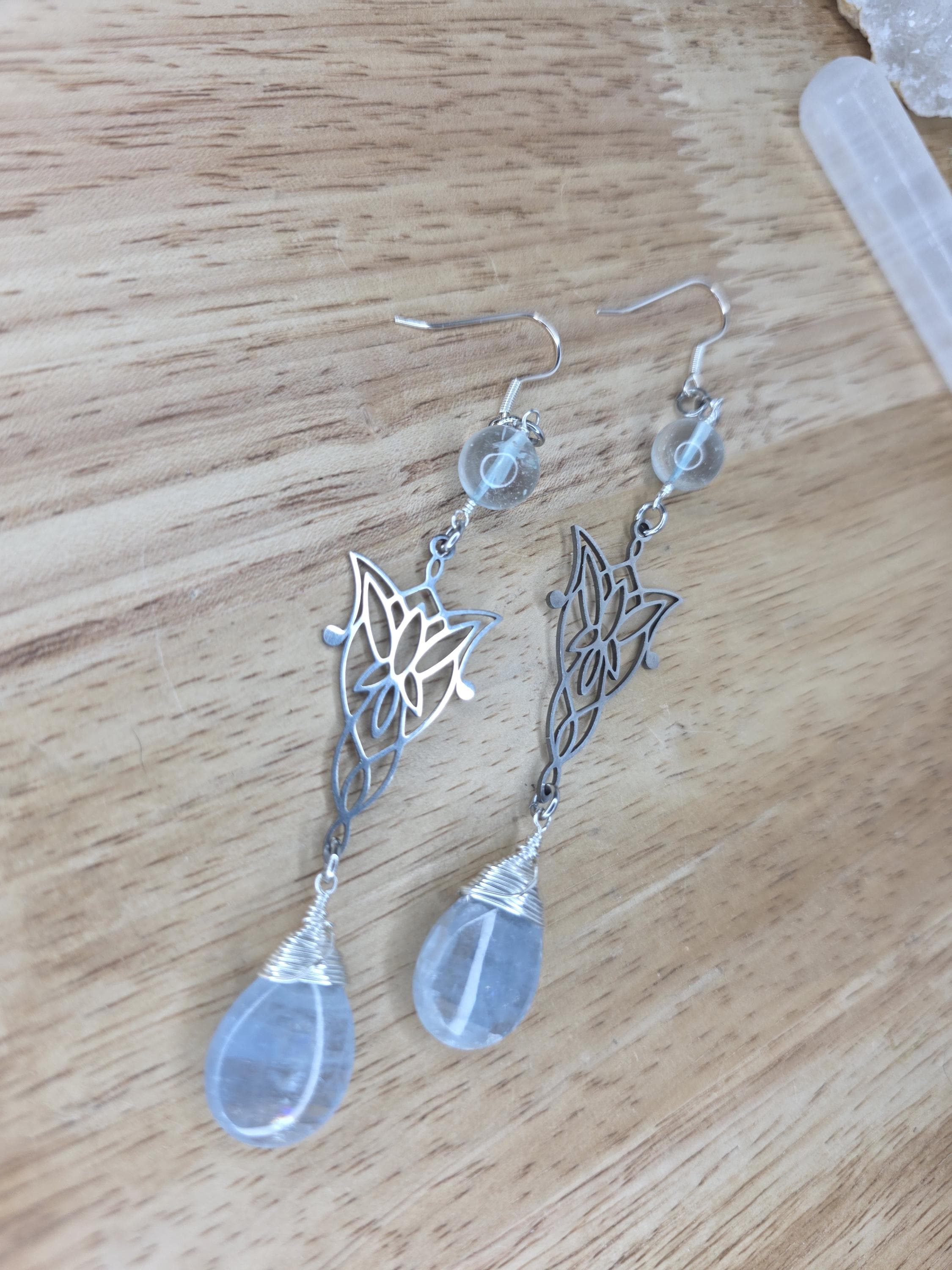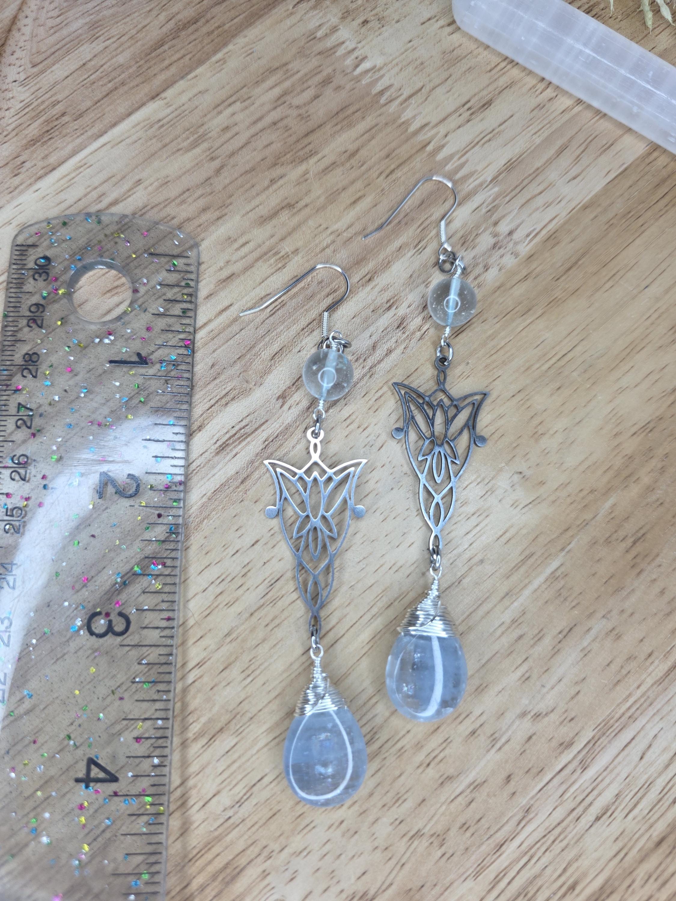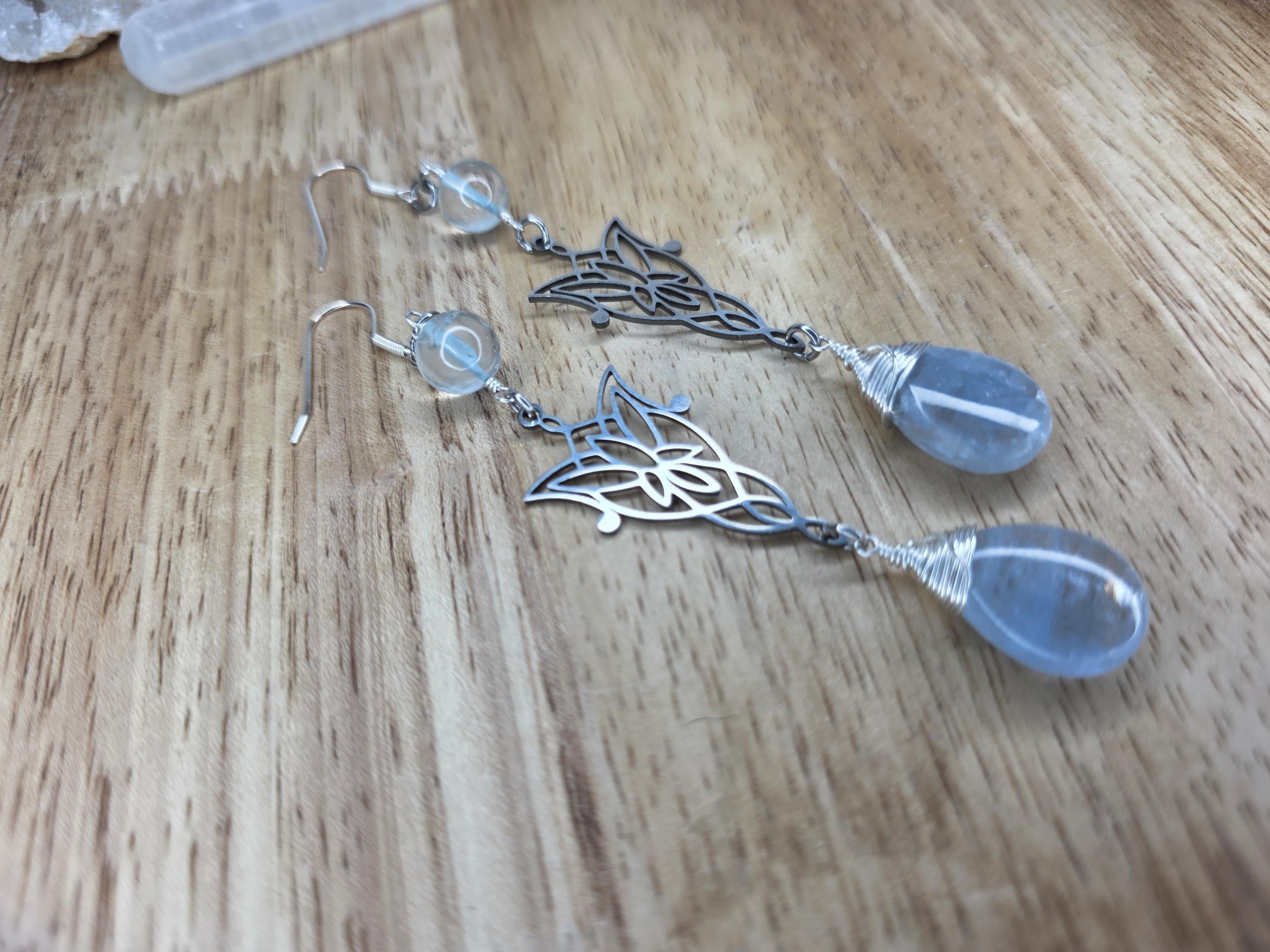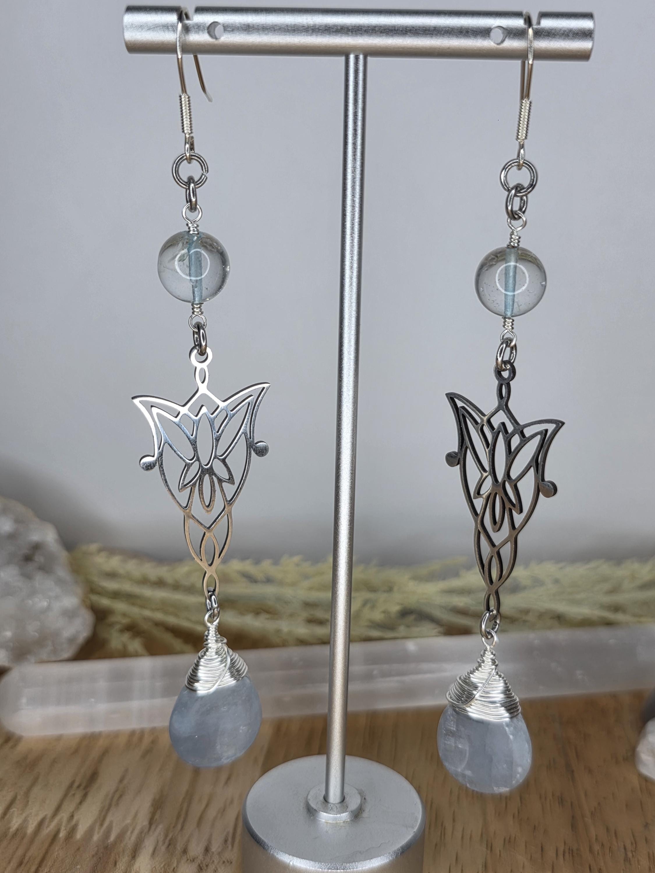 Gorgeous Blue Topaz round beads, wirewrapped with shining anti-tarnish silver wire. There are beautiful stainless steel focals that look like something a fairy would wear. To finish it off, there are beautiful Aquamarine teardrops that are wirewrapped and dangling from the bottom. Sterling Silver earwires.
