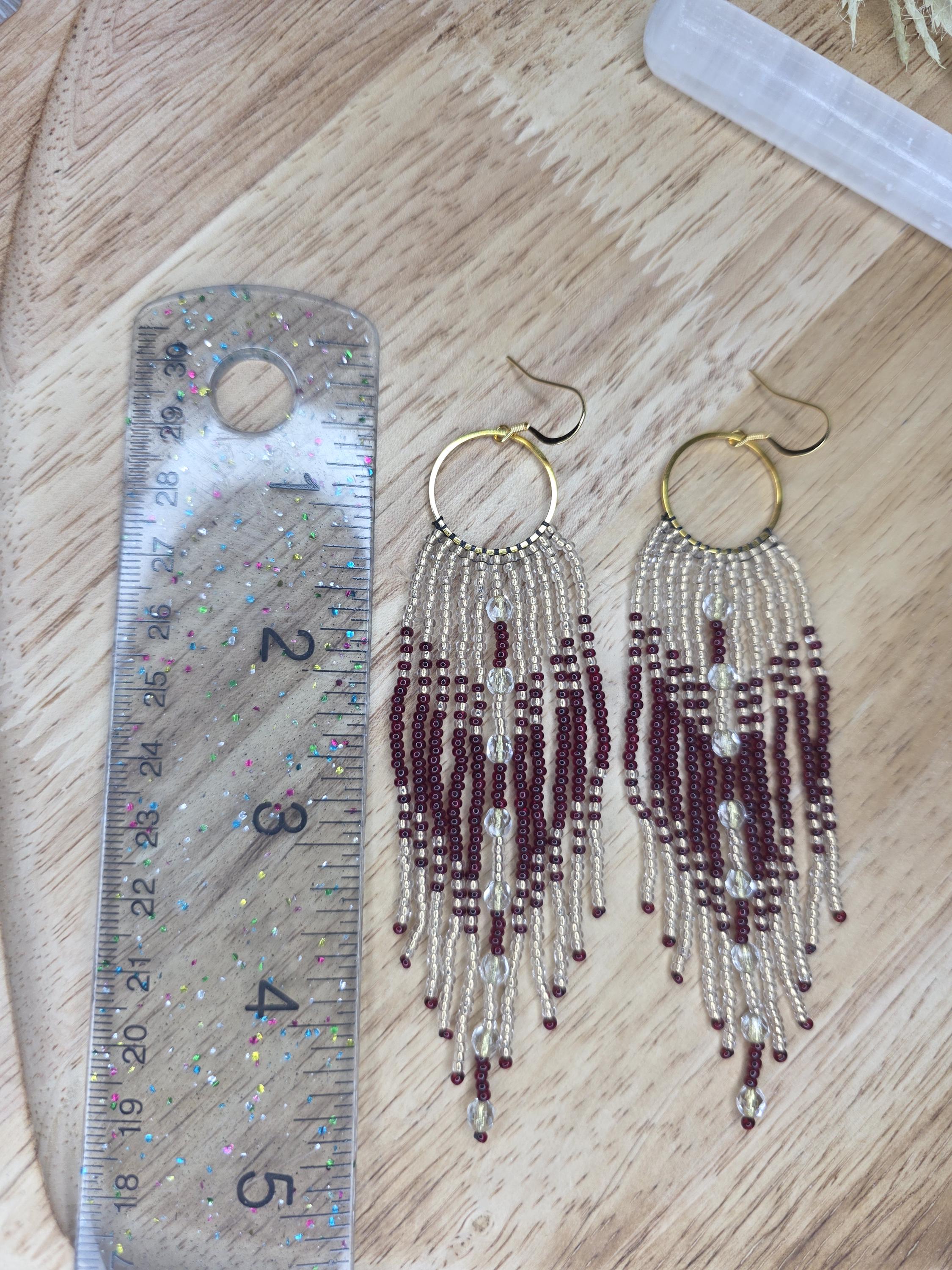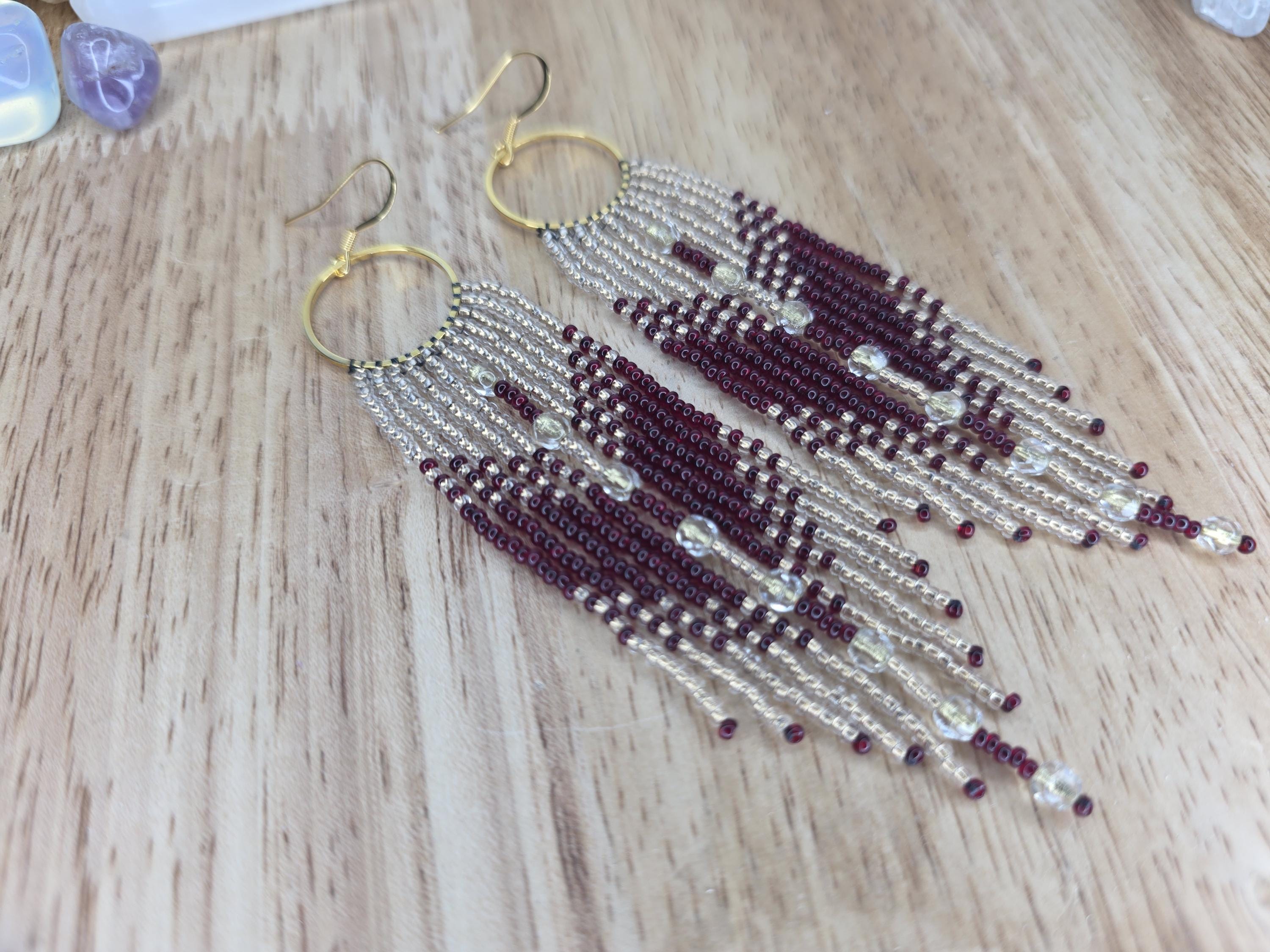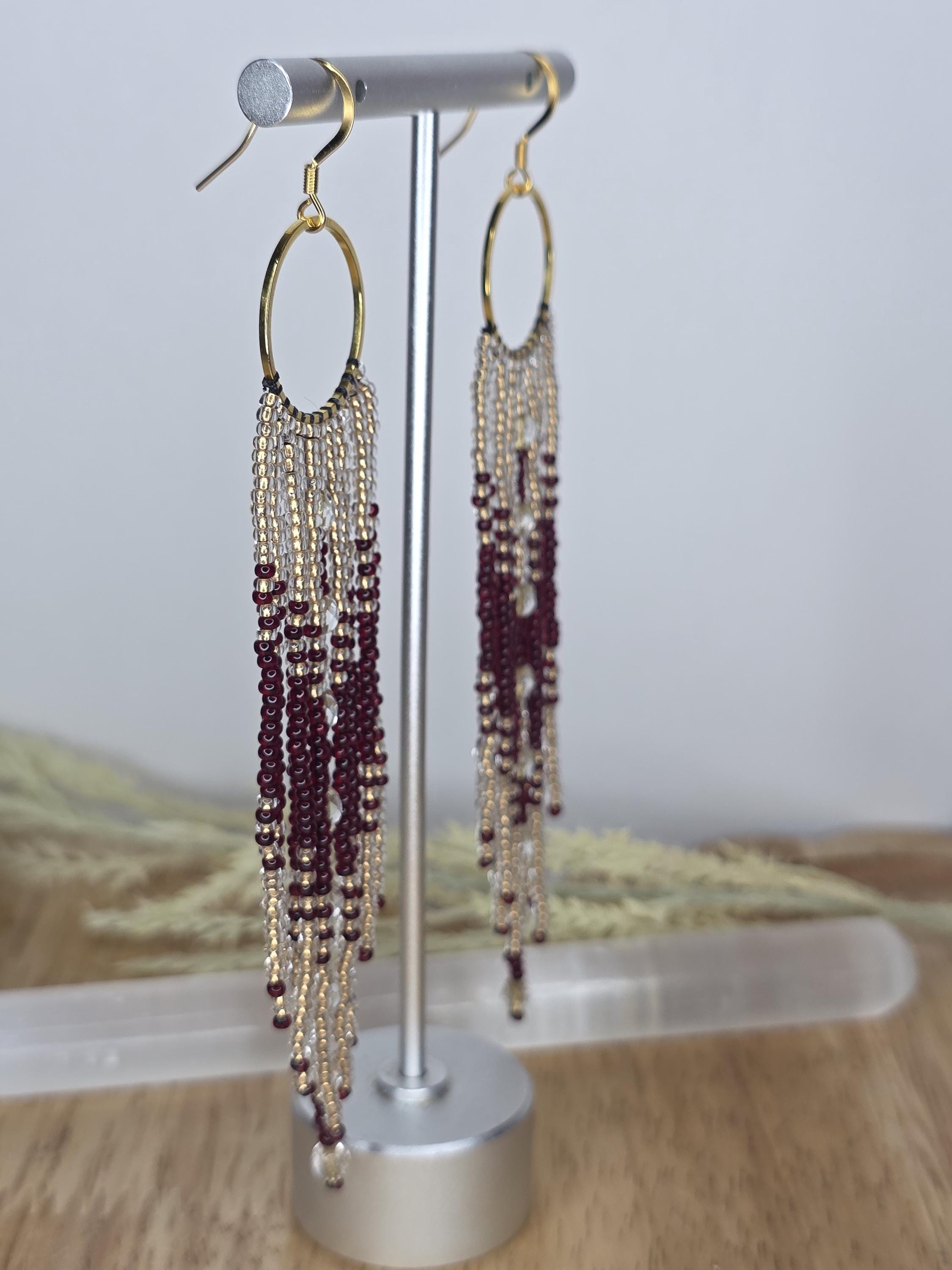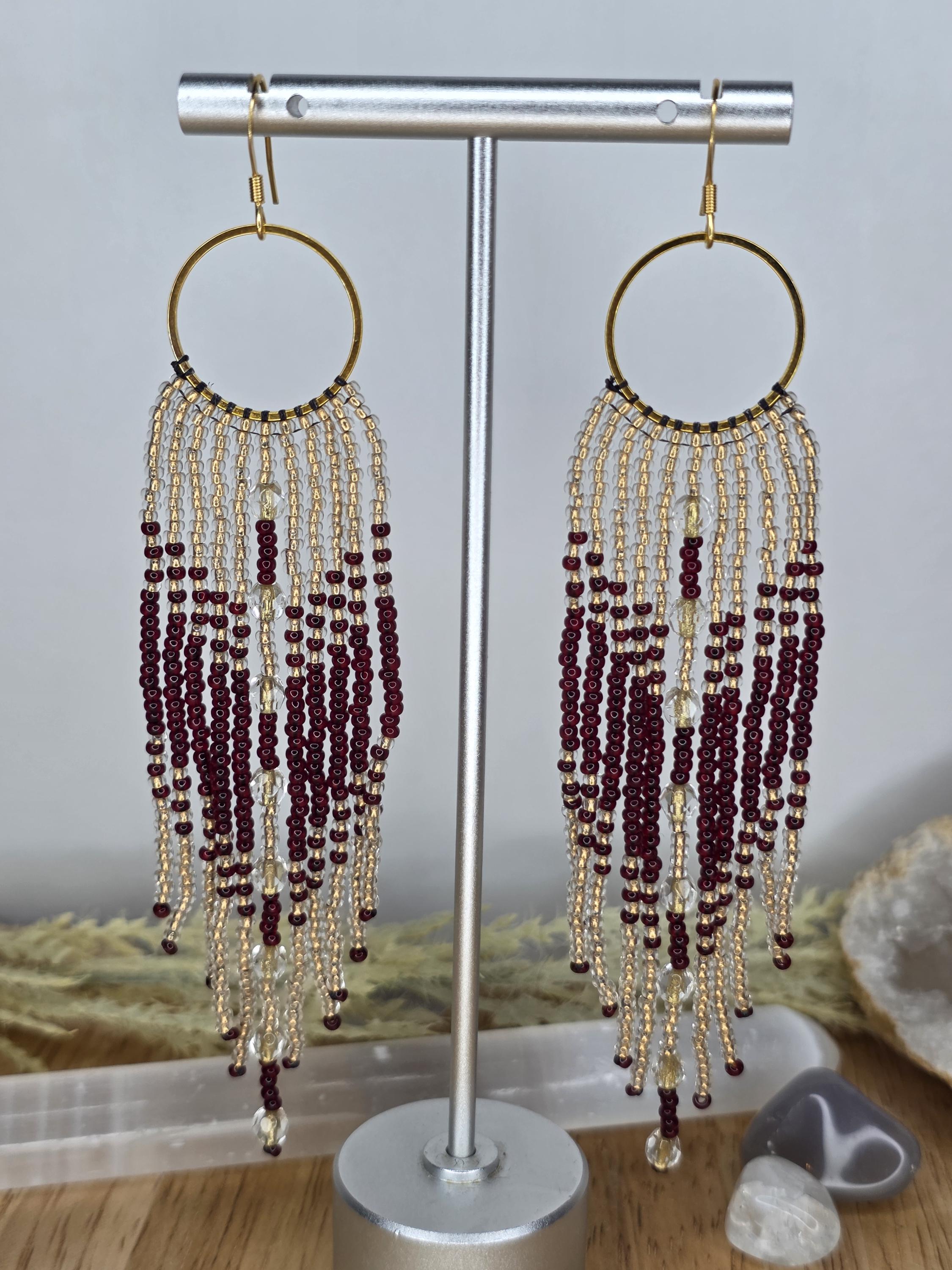 Hand Beaded Garnet and Gold earrings. These are made on a gold plated stainless steel hoop, with K.O. nylon thread. 18K gold plated stainless steel earwires. These are gorgeous deep garnet and gold lined Czech glass beads threaded in a beautiful pattern. There are gold lined larger beads in the middle for a gorgeous accent fringe. They have so much beautiful movement and look gorgeous in any lighting. They are about 5" long from the top to the bottom.