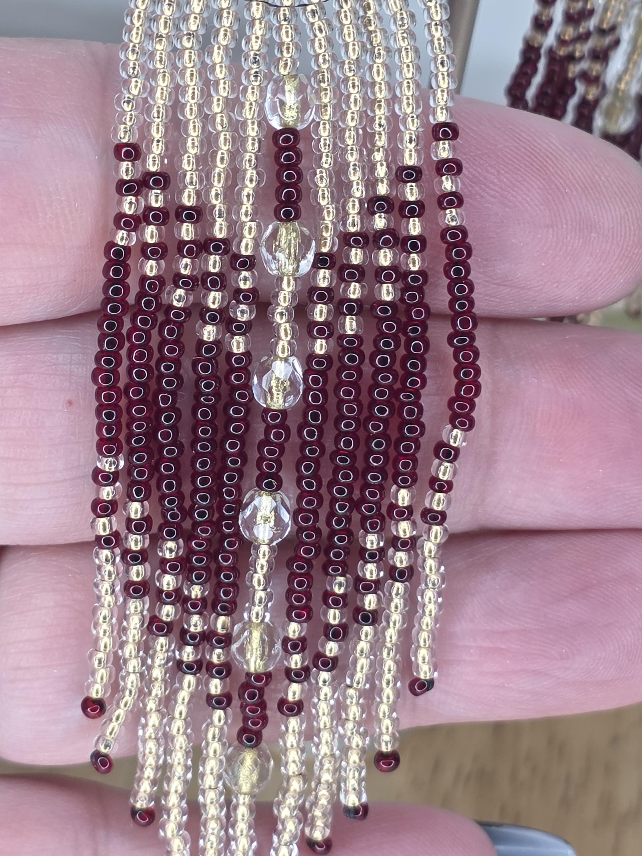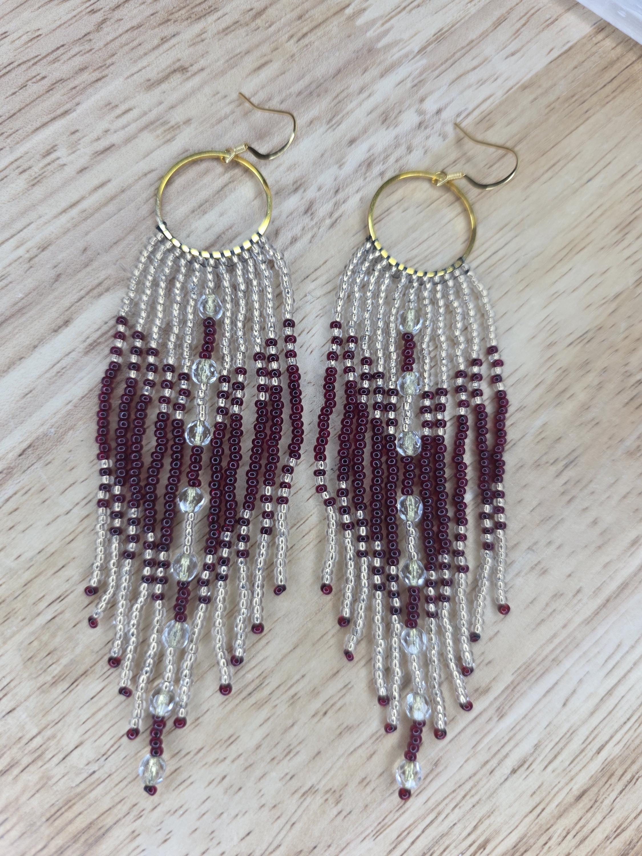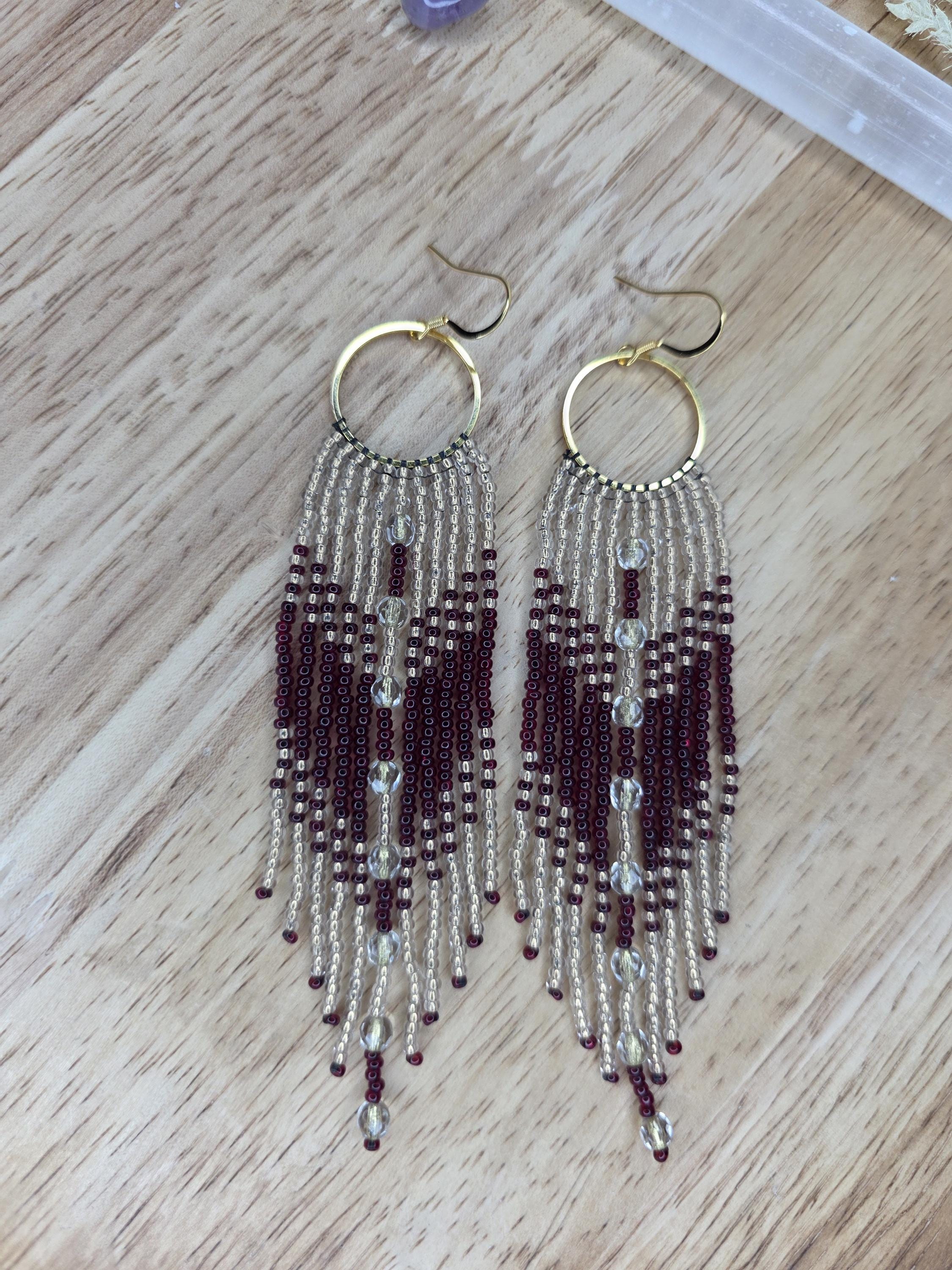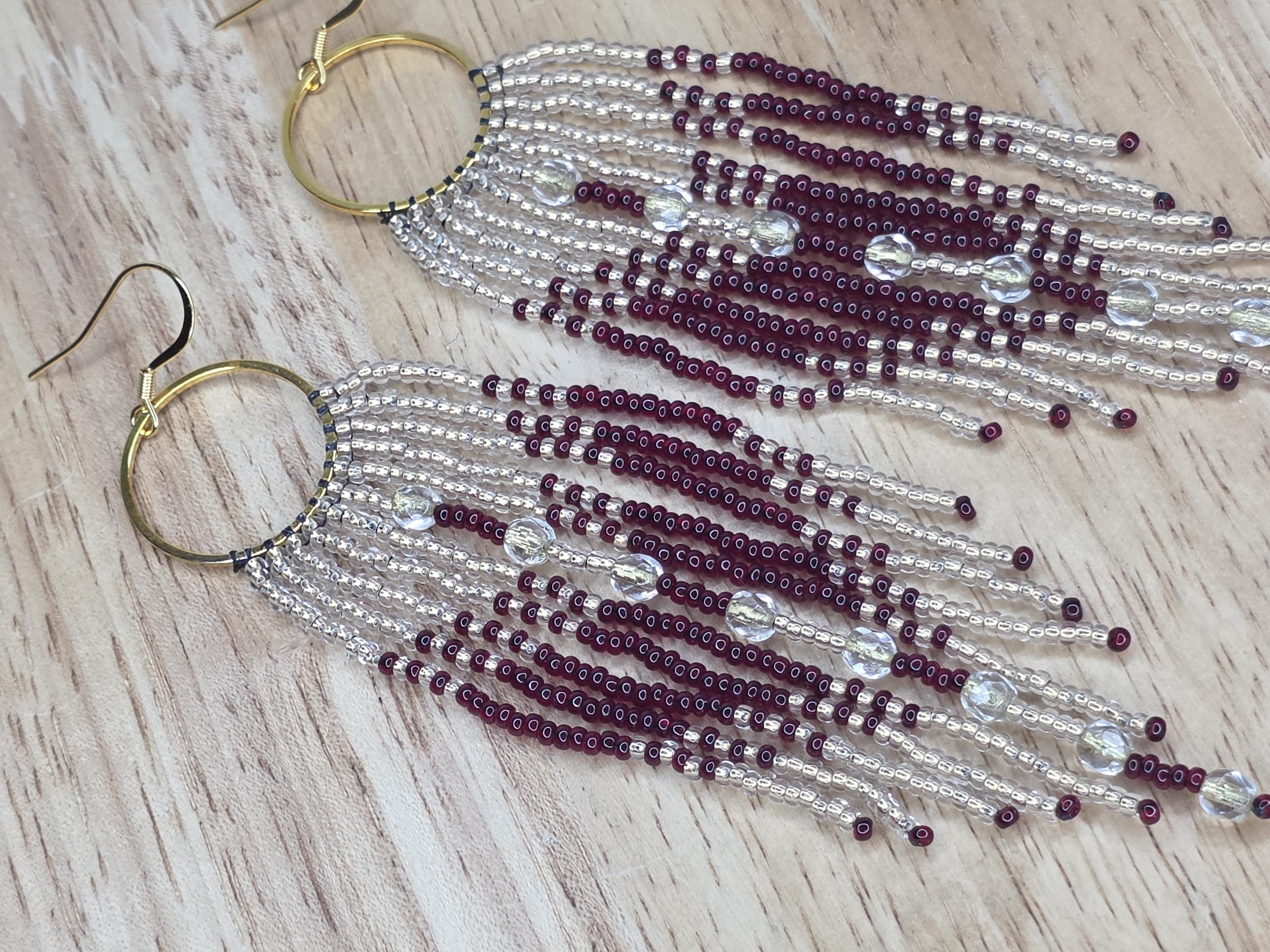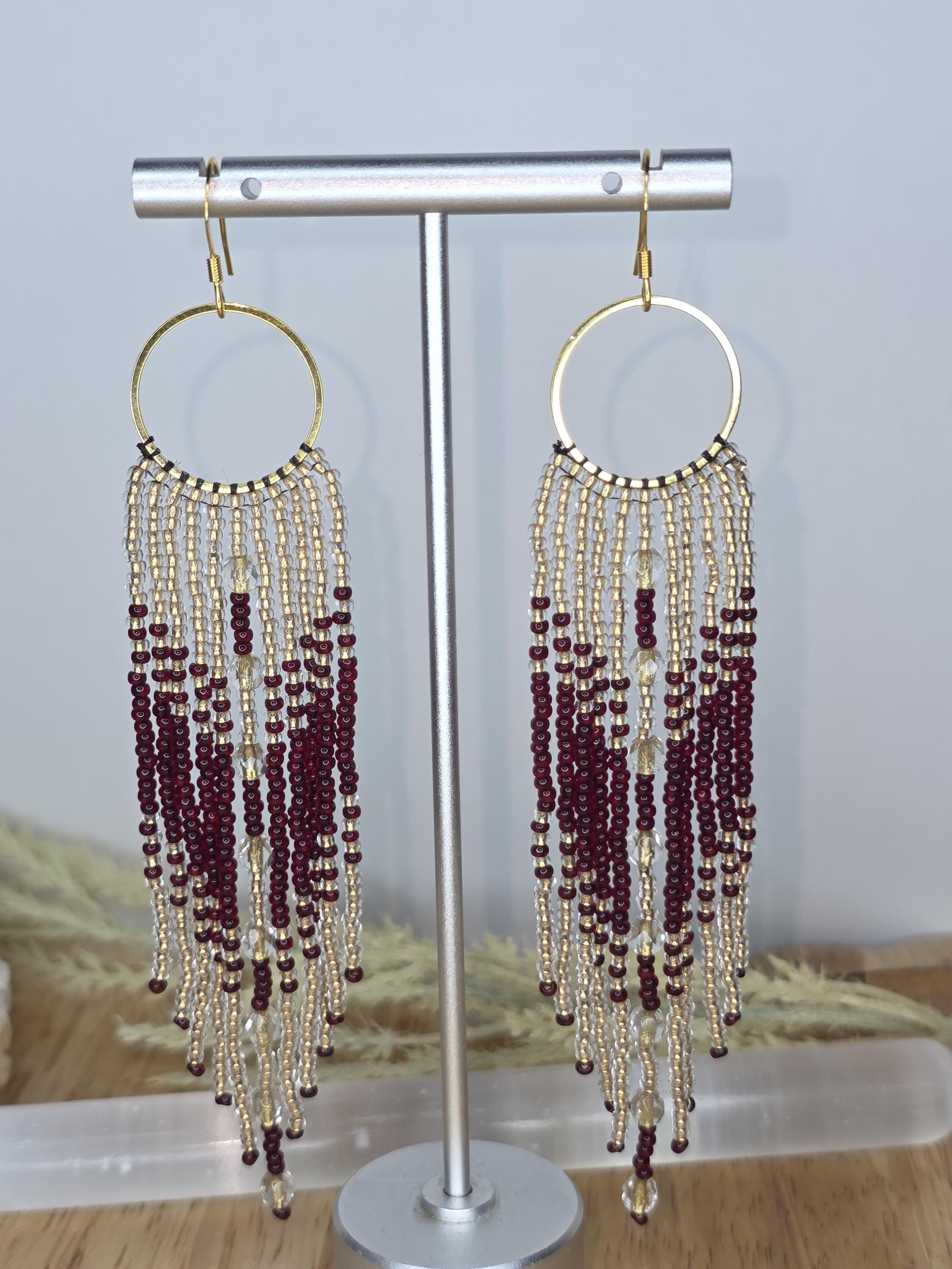 Hand Beaded Garnet and Gold earrings. These are made on a gold plated stainless steel hoop, with K.O. nylon thread. 18K gold plated stainless steel earwires. These are gorgeous deep garnet and gold lined Czech glass beads threaded in a beautiful pattern. There are gold lined larger beads in the middle for a gorgeous accent fringe. They have so much beautiful movement and look gorgeous in any lighting. They are about 5" long from the top to the bottom.